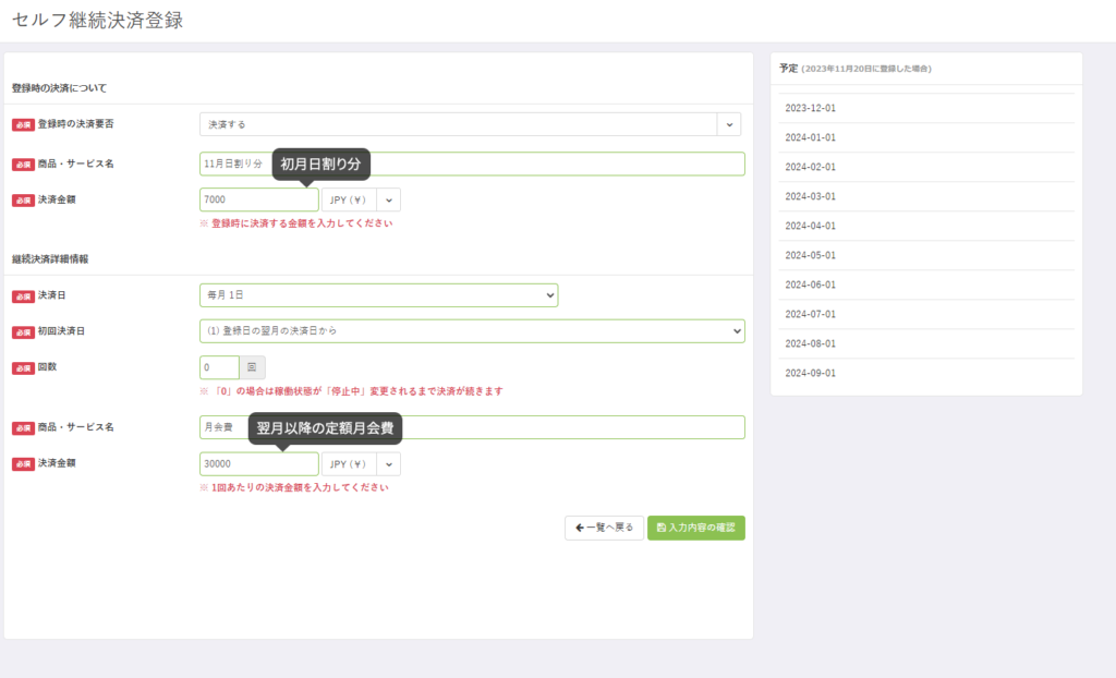 上図の設定の場合、11月入会時に7,000円の決済処理と同時に継続課金登録(カード情報登録)を行い、翌月12月以降は毎月1日に30,000円を自動で処理する設定となります。
