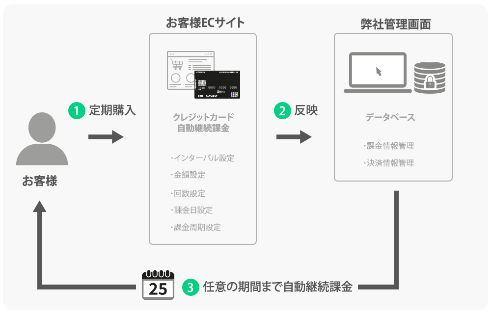- 一度設定すると自動的に課金処理されるため、EC事業者様、ユーザー様の手間が必要無し