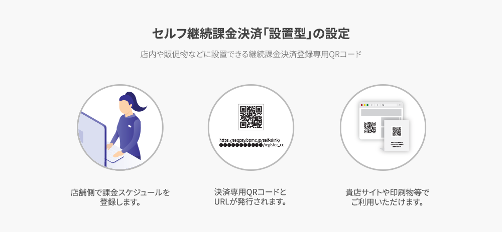 ・設置型セルフ継続決済では作成したリンクURLを貴店WEBサイトやセールスレター等に貼り付けることでお客様ご自身でカード情報をご入力していただけます。カード情報登録時に初回決済の有無や登録月の決済処理の有無を選択設定が可能です。