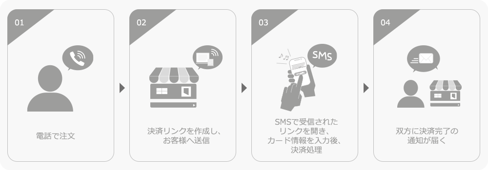 ご注文を受け、お客様のスマートフォンへ生成した決済ページリンクURLをSMSで送信します。その後はお客様ご自身がカード情報をご入力していただき決済処理を行っていただくだけで完了となります。もちろん、決済の合否は瞬時に店舗様ご指定のメールアドレスにメール送信され、お客様にも支払確認書が送信されます。デリバリー業種や遠隔での売上回収に便利な機能です。